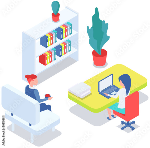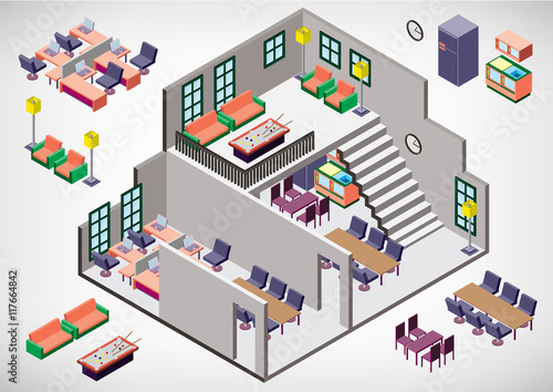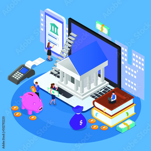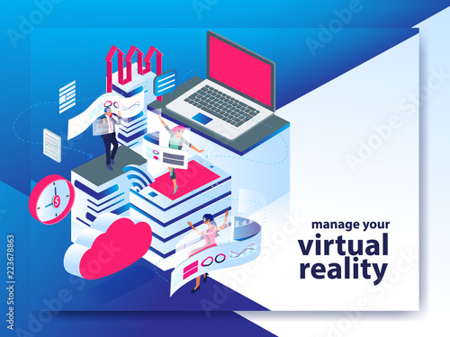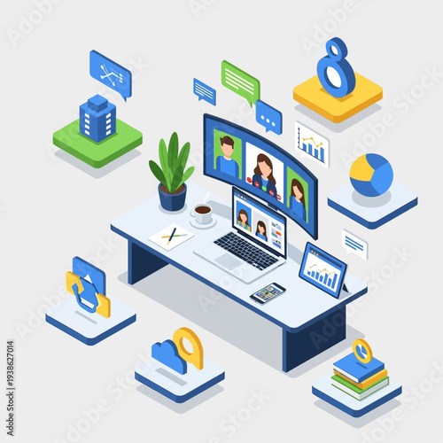 Předplatné streamovaného obsahu jako vektor obchodního modelu. Zákazník využívající prémiovou službu s různým obsahem izometrické 3D ilustrace. Technologie Cloud computingu a sociální problémy