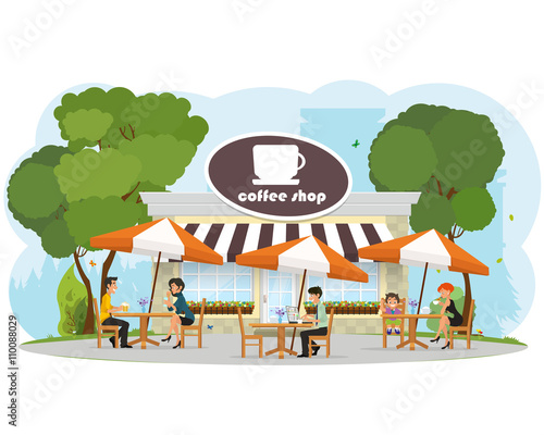 Street food concept vektorové plakáty. Lidé prodávají jídlo ze stánků v parku. Koncept pouliční kavárny. Restaurace letní terasa pod slunečníkem