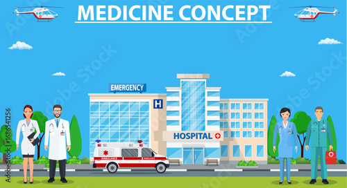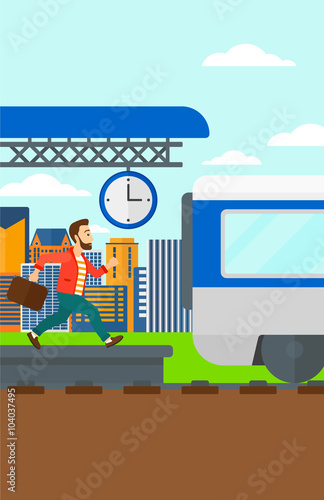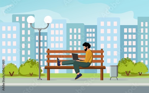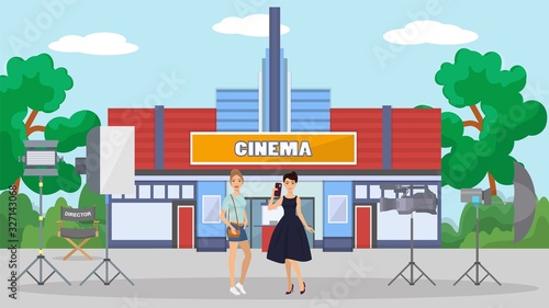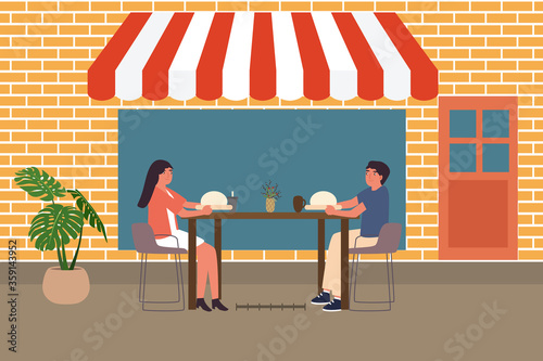 Street food shop vektorové plakát šablony. Šťastný nakupující mužská postava s nákupním vozíkem plným potravinářských výrobků před oknem obchodu s potravinami, ilustrace designu plochého stylu.