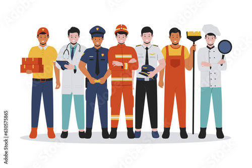 Sada ikon Vector street people. Školník nebo pouliční zametač, prodavač zmrzliny, skateboardista, taxikář a mladý muž ve sluchátkách poslouchající prvky designu s plochým stylem.