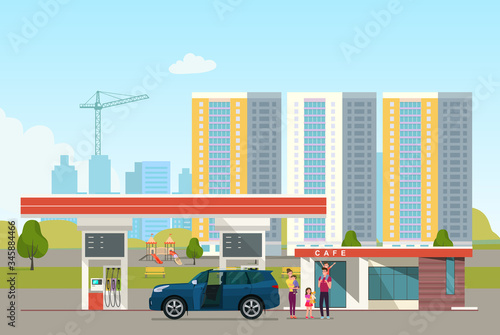 Street traffic concept vektorová ilustrace v plochém provedení. Automobily jdou přes hlavní ulici. Lidé čekají na městský autobus na autobusové zastávce. Žena volá taxi.