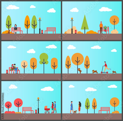 Vektorová sada plakátů street workout concept, bannery. Silní atletičtí muži cvičí na pouličních tréninkových zařízeních, Mladý pár jogging, ženy dělají hula hoop, švihadlo a fyzická cvičení.