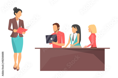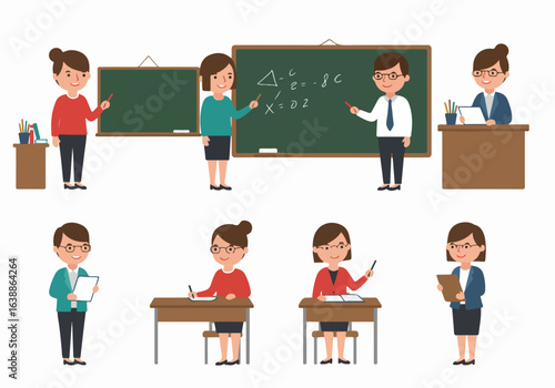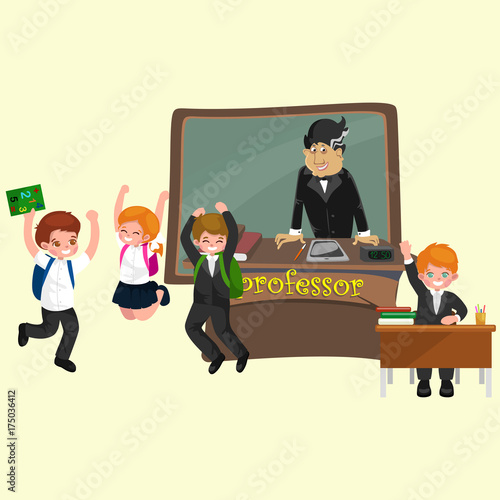 Vektorové ilustrace školních dětí chlapec a dívka sedí u stolu ve třídě. Školní lidé koncept plochý styl designový prvek, ikona izolované na bílém pozadí.