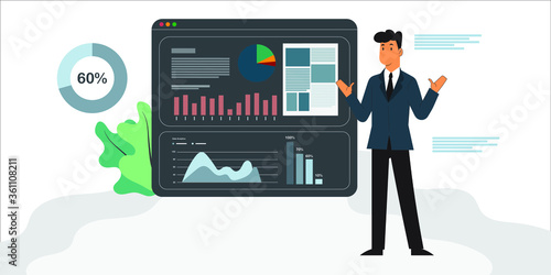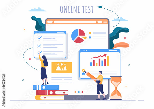 Studenti studující z domova pomocí počítačů, ploché vektorové ilustrace. Mužská a ženská postava s knihami, dalekohledem. Online a distanční vzdělávání, digitální knihovna, online škola.