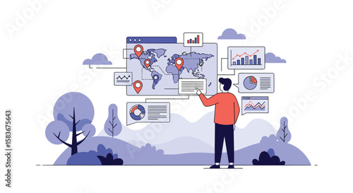 Studie koncepce vektoru plochý styl designu ilustrace. Obrovská planeta Země zeměkoule a mikro postavy studenti nesoucí hromadu knih, kalkulačka. Vzdělávací kurz, studium v zahraničí.