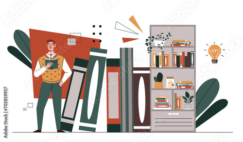 Úspěšný obchodní muž vůdce s červenou vlajkou vede svůj tým k úspěchu, vektorové ploché ilustrace. Mužské a ženské postavy kolegové budování sloupcový graf, držení zařízení. Koncepce vedení podniku.