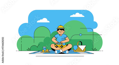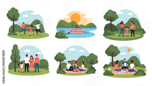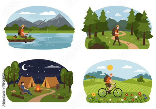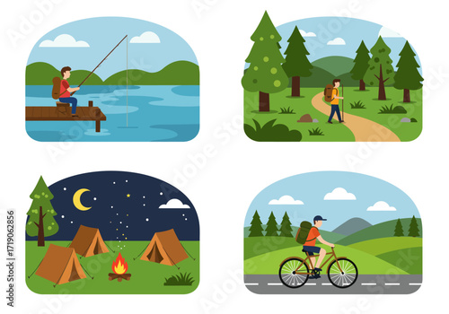Letní bbq, pikniková scéna, plochá vektorová izolovaná ilustrace. Lidé vaří klobásy na grilu, hrají na kytaru, leží v houpací síti, meditují, sedí u táboráku, cestují karavanem.