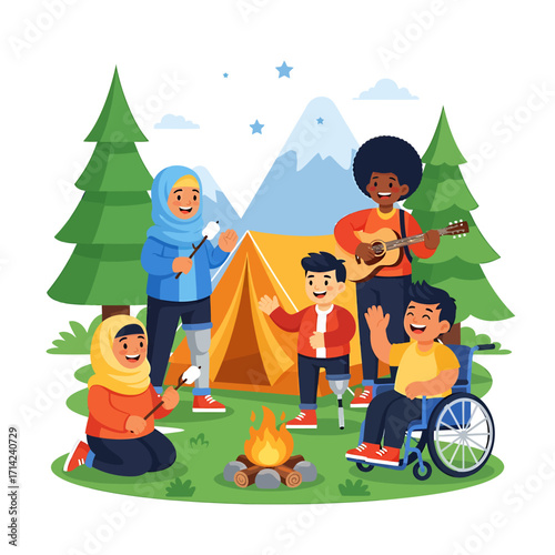 Letní bbq scéna. Žena hraje na kytaru sedí u táboráku, ploché vektorové ilustrace. Piknikový koš. Vaření jídla nad ohněm, venkovní piknik, cookout, bbq party.