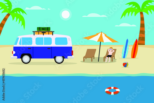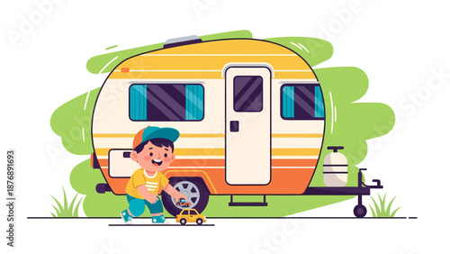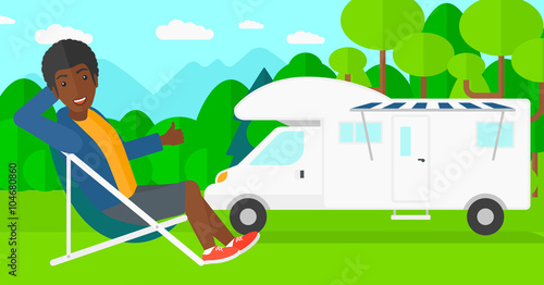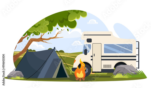 Letní bbq scéna. Mladá žena čte časopis ležící na dece vedle karavanu, plochá vektorová ilustrace. Dívka cestující obytným vozem. Letní prázdninový tábor, bbq party.