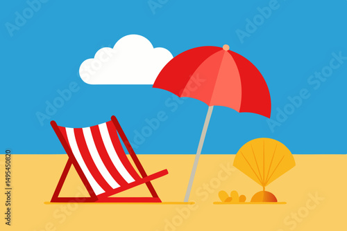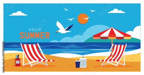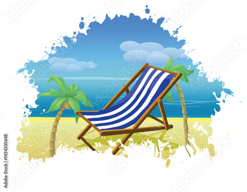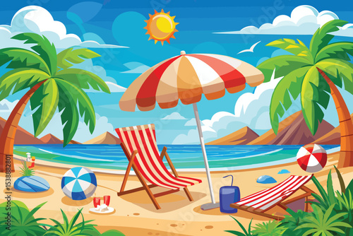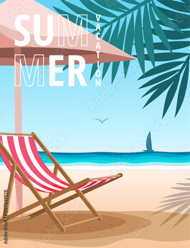 Letní pláž vektorové papír střih ilustrace. Ocean beach s lehátkem, žabky, sluneční brýle, palmové listy, hvězdice, loď plovoucí na vodě. Koncept letních prázdnin pro plakát, banner, kartu.
