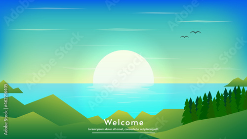 Letní tábor, vektorové ilustrace ve stylu papírového umění. Kempovací přívěs a táborák na břehu řeky, krásný les a Horská krajina. Karavan kempování, letní dovolená plakát, banner šablony.