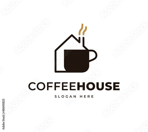 Letní tábor vintage logo s kouřící čaj hrnek přes vrchol hory. Venkovní dobrodružství v divoké lesní tábor odznak izolovaných na bílém pozadí. Eco cestování a cestovní ruch