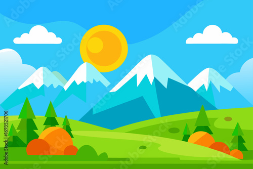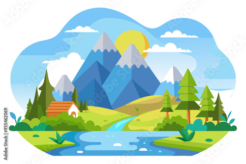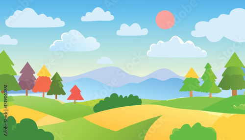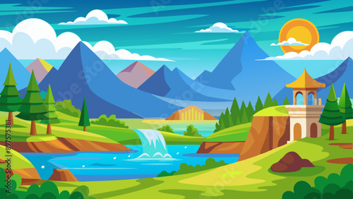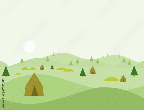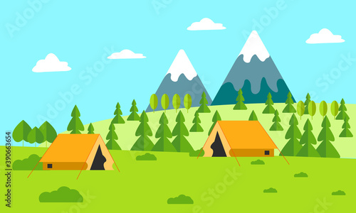 Letní kemp pozadí s lesem, hory, jezero, táborák a Stan. Vektorové ilustrace ve stylu papírového umění.