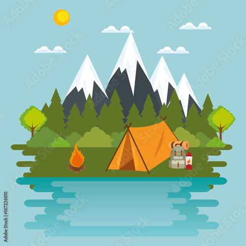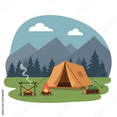 Letní turistika. Kemp s kempovými stany a šťastnými ženami meditujícími, vařením jídla v ohni, pitím čaje, plochou vektorovou ilustrací. Trekking, expedice, Cestovní dobrodružství, přírodní turistika, kempování.