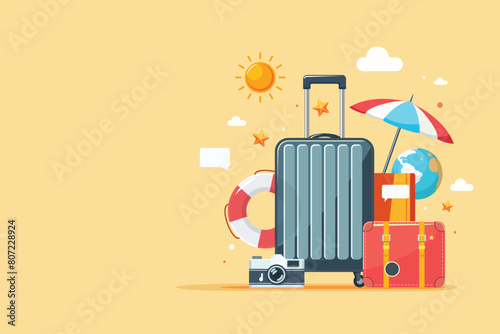 Letní dovolená vektor. Tropická dovolená 3D plakát. Opalovací krém, nafukovací míč, zmrzlina, slunce, kufr na zavazadla, šnorchlovací maska pro potápění dovolená dovolená položka ilustrace