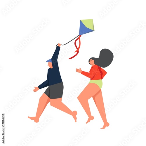 Pár létající drak na provázku, vektorový plochý styl designu ilustrace. Summer beach kite-flying activity concept pro webový banner, webovou stránku atd.