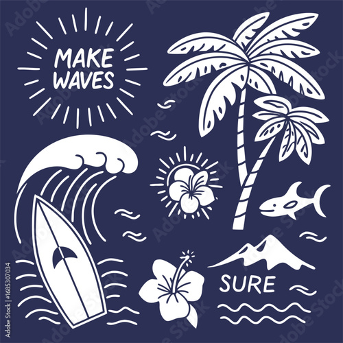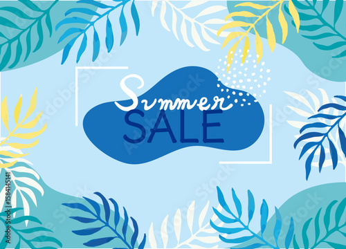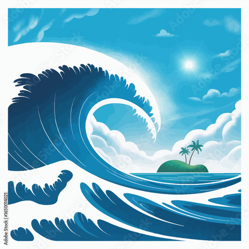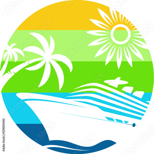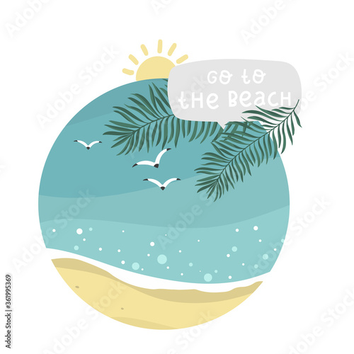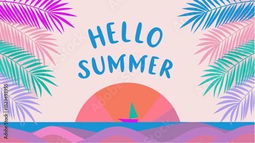 Letní vrstvený papír umělecký styl vektorové ilustrace. Krásná tropická kompozice s papírovými řezanými oceánskými vlnami, lodí, palmou, květinami, slunečními mraky, racky. Letní kreativní ruční písmo typografie