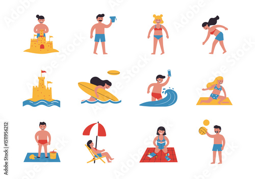 Letní lidé vektorová sada ikon. Skupina lidí, kteří cestují, opalování, jízda na skútru, hraní frisbee, surfování, jíst zmrzlinu. Plochý styl designové prvky izolované na bílém pozadí.