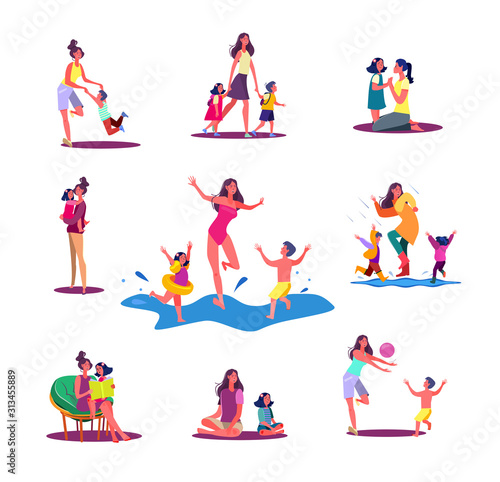 Vektorová ilustrace cestujících, kteří odpočívají na pláži, Cestovní kancelář nabízející výlety. Letní lidé symboly, ikony izolované na bílém pozadí. Plochý design.