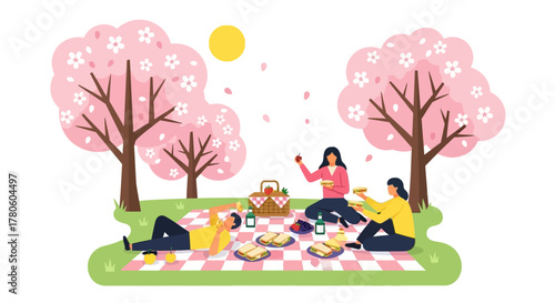 Letní piknik. Šťastná dívka ležící na dece a pomocí mobilního telefonu, ploché vektorové ilustrace. Piknikový koš. Životní styl mladých lidí. Sociální média a závislost na chytrých telefonech.