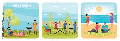 Letní dovolená na tropické pláži dovolená koncept vektorové ilustrace. Lidé hrají volejbal na písku. Pár pít víno a sledovat západ slunce v parku. Přátelé na piknik, venkovní aktivity.