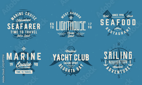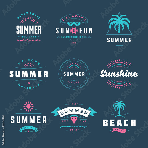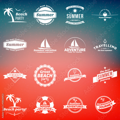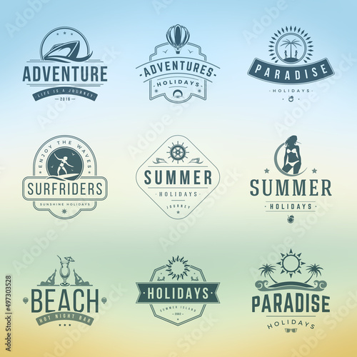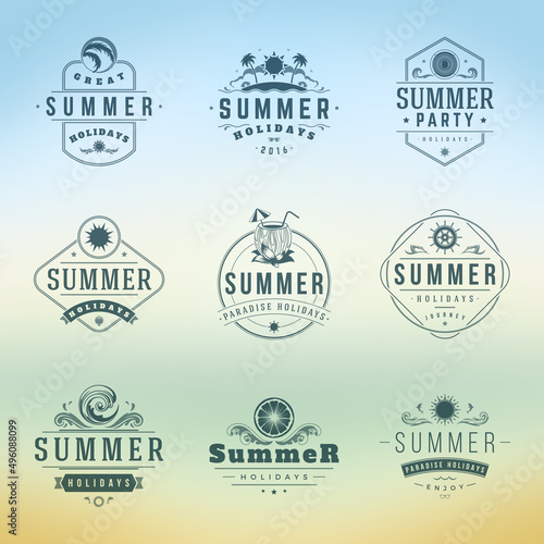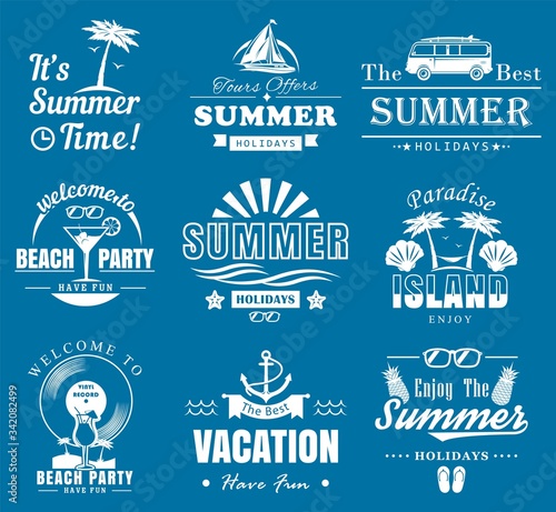 Letní čas cestování vintage logo, štítek, odznak set, vektorové ilustrace. Letní prázdniny, výletní dovolená, plážová párty, výlet bílé emblémy na modrém pozadí.