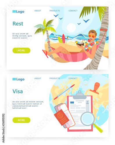 Letní tropická dovolená cestování. Dovolená na pláži. Suvenýr. Vektorové webové stránky design šablony. Ilustrace konceptu webové stránky vstupní stránky.