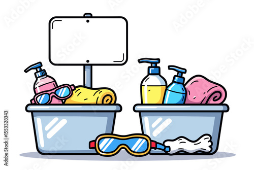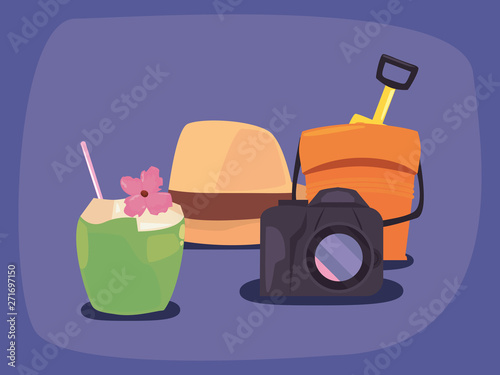 Letní prázdniny vektorové ploché ilustrace. Taška a plážové doplňky slunečník, opalovací krém, fotoaparát, sklenice limonády, meloun, ruční držení dolarové mince. Letní cestovní plakát, banner.