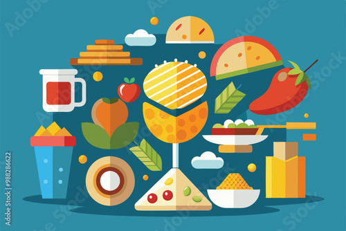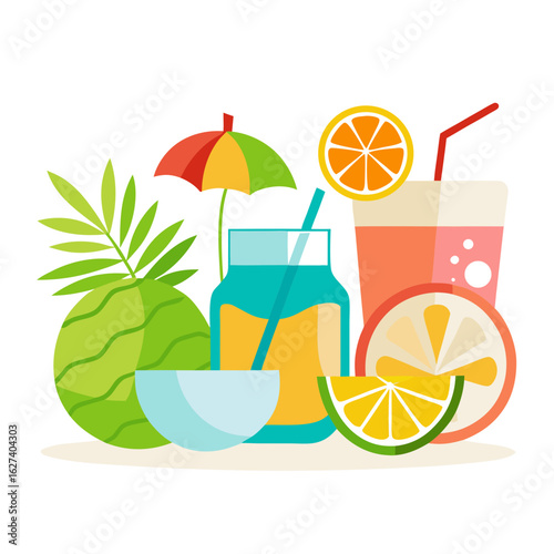 Letní prázdniny vektorové ploché ilustrace. Taška a plážové doplňky slunečník, opalovací krém, fotoaparát, sklenice limonády, plátek melounu, sluneční brýle, dolarové mince. Letní prázdniny plakát.