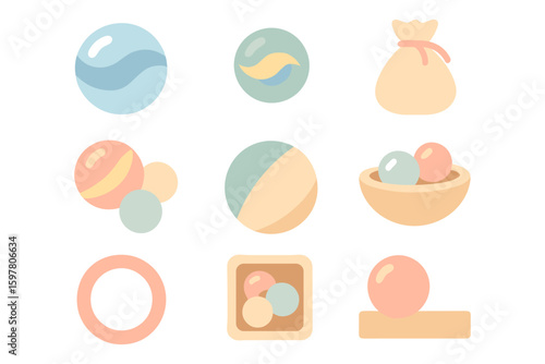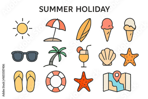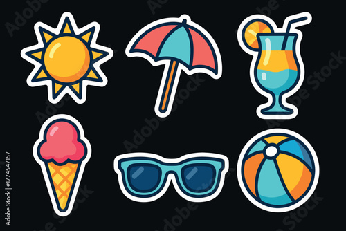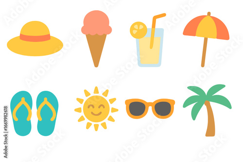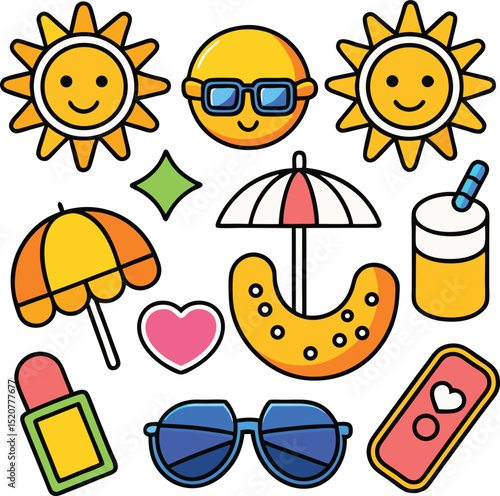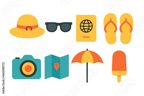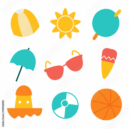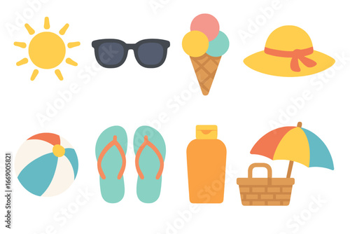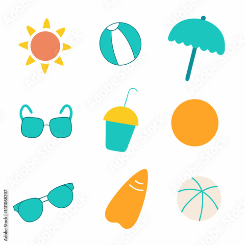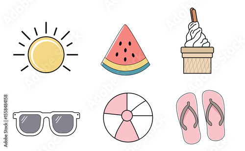 Letní ikona izolované vektorové sady. Opalovací krém, sluneční brýle, nafukovací míč, zmrzlina, pantofle, slunce, taška na zavazadla, plátek melounu, potápění šnorchlování maska dovolená dovolená položka ilustrace
