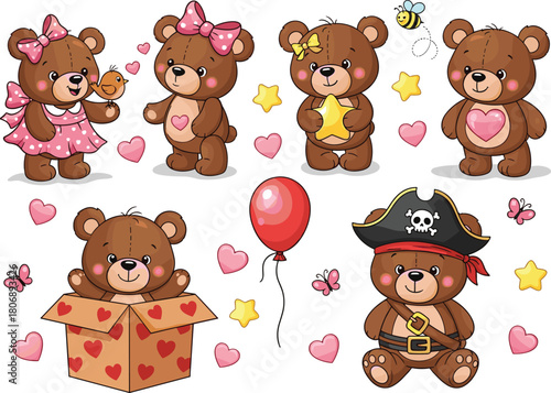 Letní bezešvé vzor. Vektorové ručně kreslené Legrační medvědi, zmrzlinové kužely a hvězdice.