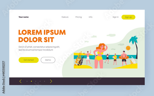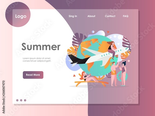 Letní vektorová webová šablona, návrh webové stránky a vstupní stránky pro vývoj webových stránek a mobilních stránek. Letní dovolená na pláži, cestování letadlem, cestovní ruch, koncept světové cesty.