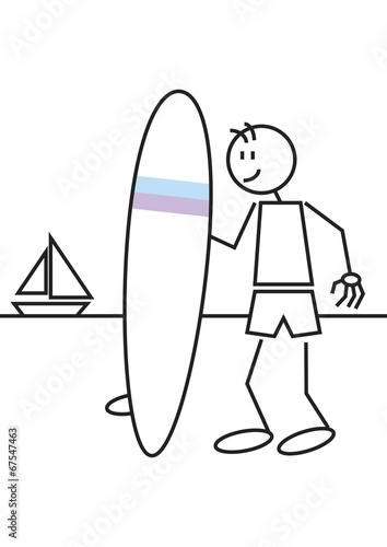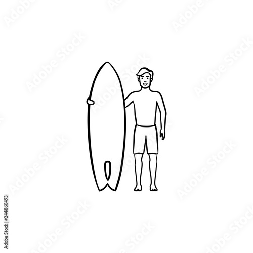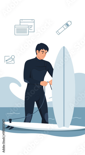 Muž surfař stojící s Surf, vektorové ploché ilustrace izolované na bílém pozadí. Koncept letních vodních sportů pro webový banner, webovou stránku atd.