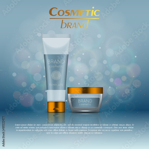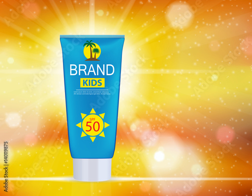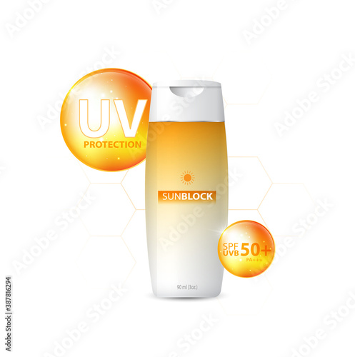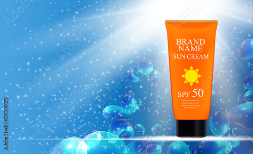 Opalovací krém kosmetické výrobky ad. Vektorové 3D ilustrace. Šablona láhve na krém proti slunečnímu záření, design kosmetických přípravků na ochranu před sluncem. Opalovací krém na obličej a tělo s SPF a UV ochranou.
