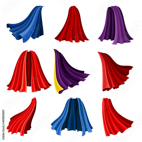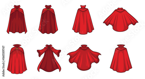 Superhrdina červený hedvábný plášť, plášť, plášť, přední zadní a boční pohled, vektorové ilustrace izolovaných na bílém pozadí. Karnevalové oblečení, Maškarní kostým atd.