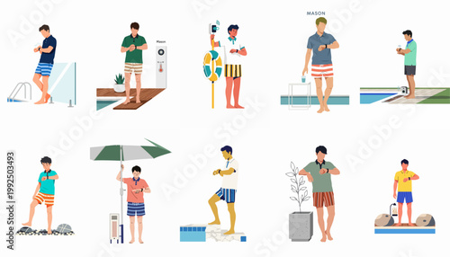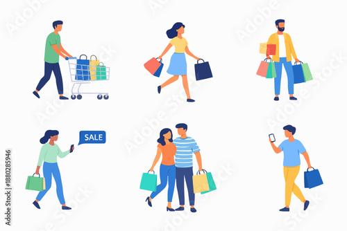 Supermarket zákazníci, vektorové ploché izolované ilustrace. Nakupující mužské a ženské postavy s nákupními vozíky a košíky, pokladní stojící u pokladny. Šťastní kupující nakupují na trhu, v obchodě