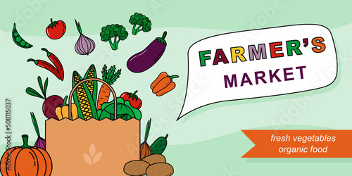 Supermarket nákupní košík plný zeleniny a ovoce, vektorové ilustrace v papírovém uměleckém stylu. Čerstvá zelenina plakát, šablona návrhu banneru.