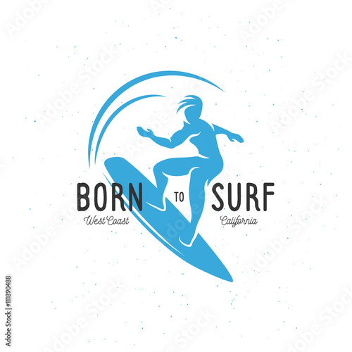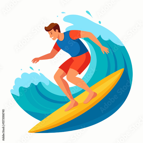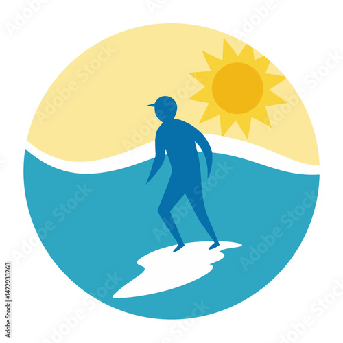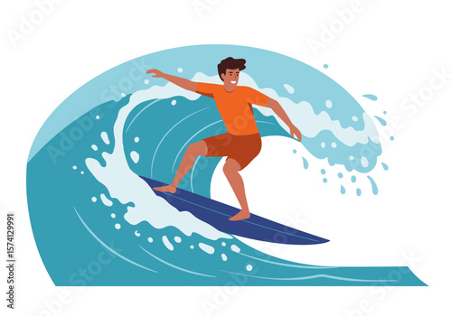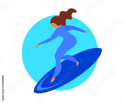 Vektorové ilustrace surfař v neoprenu stojící na surf a jízda na vlně oceánu. Beach water extreme sports concept designový prvek v plochém stylu.