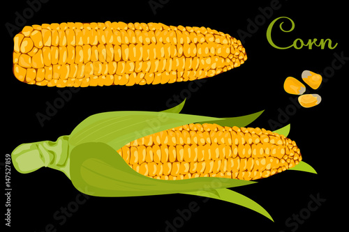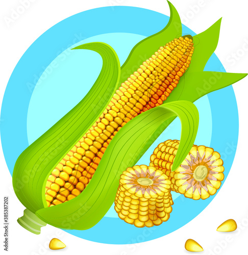 Zralé kukuřičné klasy a zrna, vektorové realistické ilustrace. Šablona designu reklamního plakátu Sweet corn s kopírovacím prostorem.