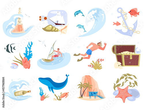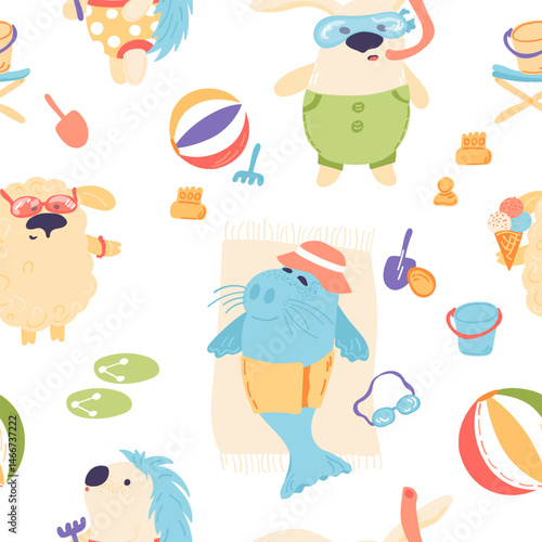 Hezké dívky hrají míč, opalování, relaxaci na nafukovacích matracích v bazénu, vektorové ploché izolované ilustrace. Ženy odpočívají, plavou v moři s nafukovacími kroužky. Letní dovolená na pláži.