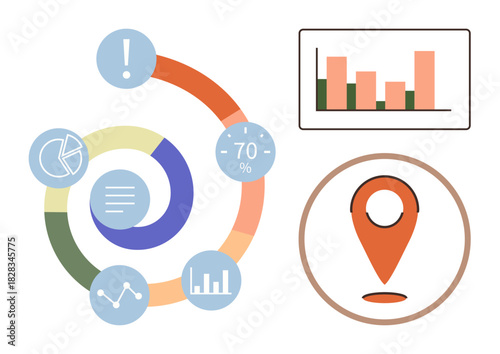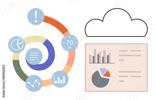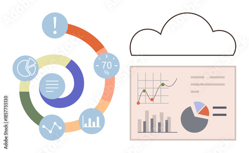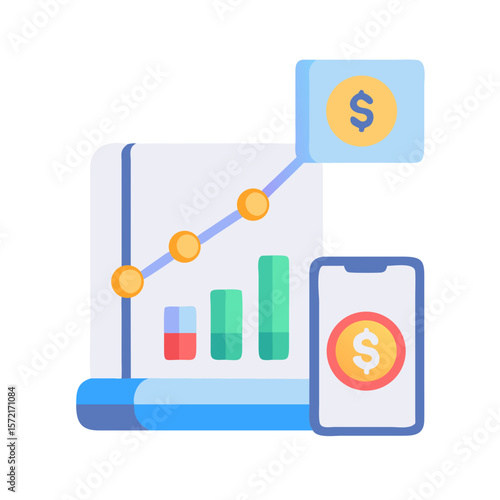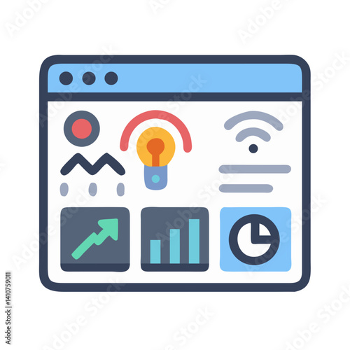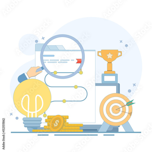 Tablet s grafy a nápad lampy na obrazovce, ploché vektorové ilustrace. Podnikatelský nápad, inovace.