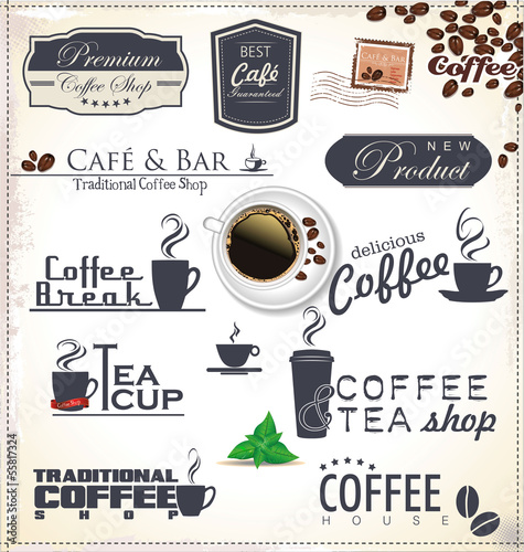 Vintage tabule káva a čaj leták design šablony. Vektor realistický šálek čaje, papírová krabička s čajovými sáčky, jednorázový šálek kávy s čmáranicemi, kávové nápoje, citace kávy a čajové věci.