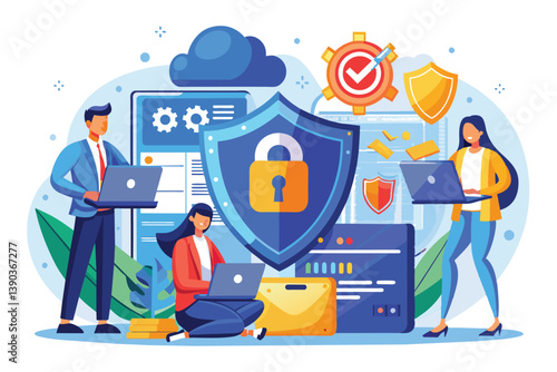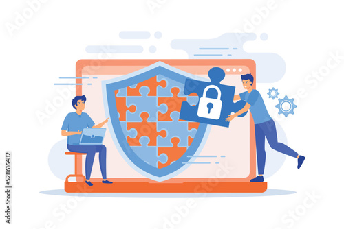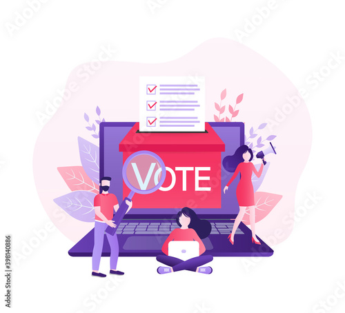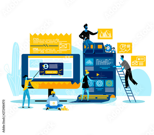 Obrovský internetový obchod s přenosnými počítači a mužské a ženské postavy, které nakupují online zdarma, vektorové ilustrace. Koncept vrácení DPH pro webový banner, webovou stránku atd.