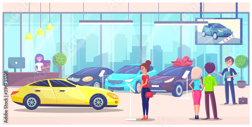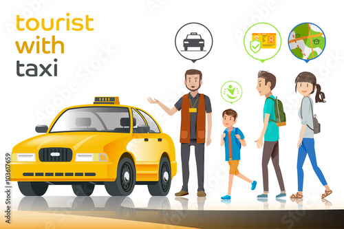 Taxislužba, vektorová plochá ilustrace. Žlutý taxík, dispečerka taxi, která posílá taxíky zákazníkům, řidič dává klíč cestující dívce s cestovní taškou. Software pro taxíky a pronájem automobilů.