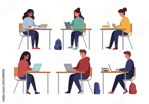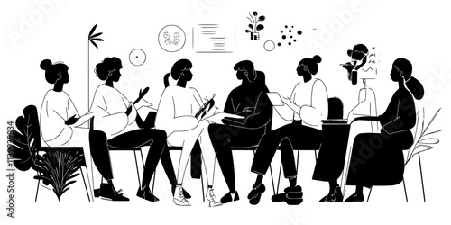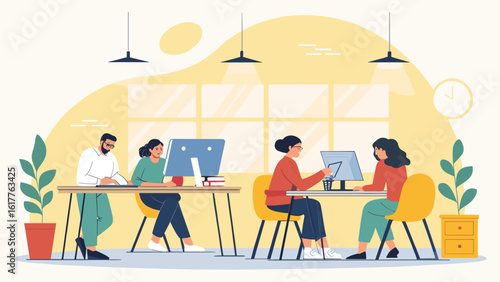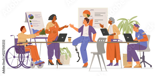 Tým podnikatelů, kteří sedí u stolu s notebookem a pracují společně v kanceláři. Obchodní jednání a týmová práce koncept vektorové ilustrace. Týmová práce, lidé v kanceláři, charakter zaměstnanců.