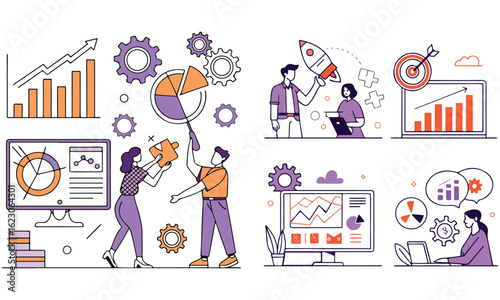 Podnikatelé pracují společně jako tým v kanceláři, setkání s partnery, vektorový plochý design ilustrace. Kreativní týmová práce, komunikace, spolupráce.