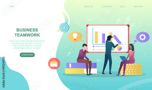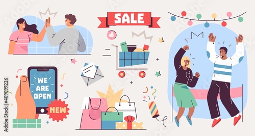 Šťastný úspěšný obchodní tým micro mužské a ženské postavy slaví vítězství, obchodní úspěch, úspěchy, vektorové ilustrace. Koncept týmové práce pro webový banner, webovou stránku atd.
