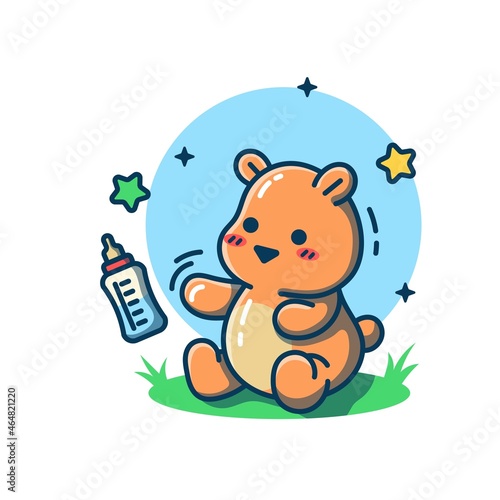 Medvídek vektor drží dítě mléko láhev s bradavkou. Roztomilá hračka ikona pro pozvání. Novorozenec dítě sprcha party oslava příslušenství izolovaných na bílém pozadí