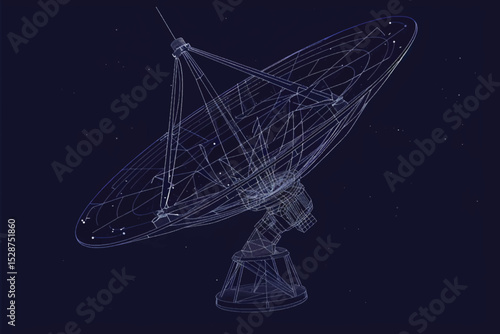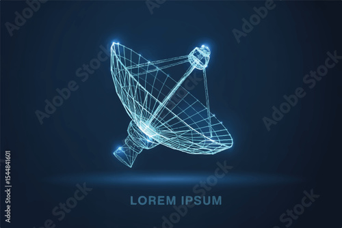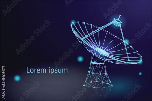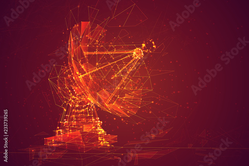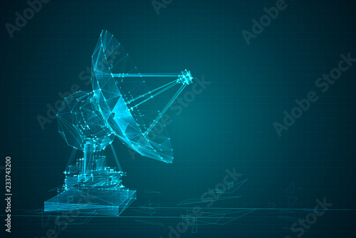 Satelitní TV a rádiové signály přijímač parabolická anténa nízká poly drátěné pletivo z bodů, čar a tvarů. Vektorové polygonální umění styl ilustrace. Plakát telekomunikačních zařízení.