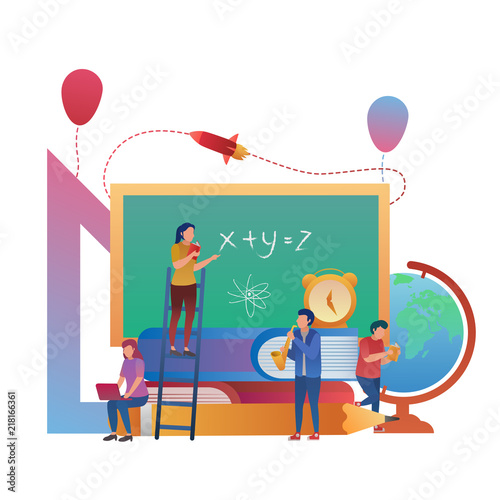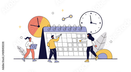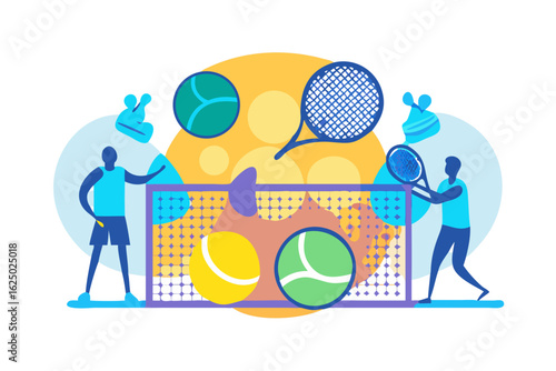 Obrovská tenisová raketa a míček, mikro mužské postavy hráči a rozhodčí s píšťalkou, vektorová ilustrace. Tenis individuální raketa sportovní herní koncept pro web banner, webové stránky atd.